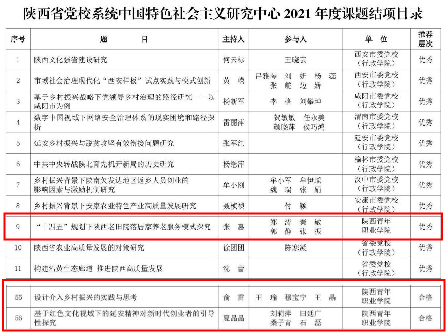近日,陕西省党校(行政学院)系统中国特色社会主义研究中心发布了《2021年度课题验收评审的通知》和《2022年度课题立项的通知》,2021年,校院交通运营服务系教师张惠主持的《“十四五”规划下陕西老旧院落居家养老服务模式探究》获优秀等次,文化传媒系教师俞雷主持的《设计介入乡村振兴的实践与思考》、马克思主义学院教师夏晶晶主持的《基于红色文化视域下的延安精神对新时代创业者的引导性探究》顺利结题。