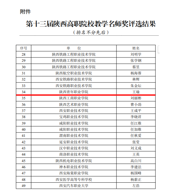 陕西高职院校教学名师奖是陕西高职院校优秀教师的重要奖项。本次全省共有49名教师获评陕西高职院校教学名师奖。