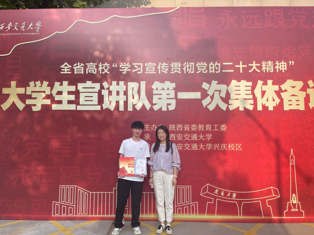 此外,5月24日,刘帅及指导教师方方应邀参加了陕西省教工委举办的全省高校“学习宣传贯彻党的二十大精神”大学生宣讲队第一次集体备课会及大学生宣讲队授旗仪式,刘帅被聘为《参考消息》数字报校园推广形象大使。(马克思主义学院/方方 供稿)
