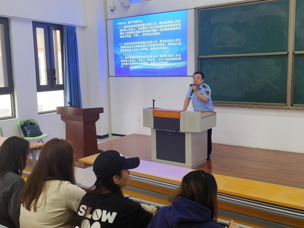 关昊楠首先结合自身打击传销工作经历,用大量的案例展示了传销的危害性,强调从传销组织中脱身不易,告诫同学们要增强防范意识,远离传销。其次,讲明了传销的类型和“1040阳光工程”、“连锁经营、纯资本运作”等名词解释,重点介绍了“南派传销”,由于南派传销不控制人身自由,注重文化教育和管理,其传销的隐蔽性更强,吸引了大批人员身陷其中。接下来,他重点分析了传销组织严密、行动诡异、编造暴富神话、高额返利等特点,播放视频短片讲解了新型传销常以“网络兼职、创业培训”的名义出现,虚构交易大盘金融投资,指出以往抓获的骨干成员和遣散的参与人员中大多是在校大学生特别是即将毕业的学生,特别提醒同学们在兼职和就业时谨慎识别。最后,介绍了“牢记环境位置、伪装重病求医、传递求救信息”等逃离传销组织的经验,并提出预防传销诈骗的三个要点:一是做事不能抱有侥幸心理和投机心理。二是学习识别各种传销手法,时刻保持头脑清醒,提高防传销意识。三是要注意审查资质,警惕非正常的培训课,尤其警惕网络传销。