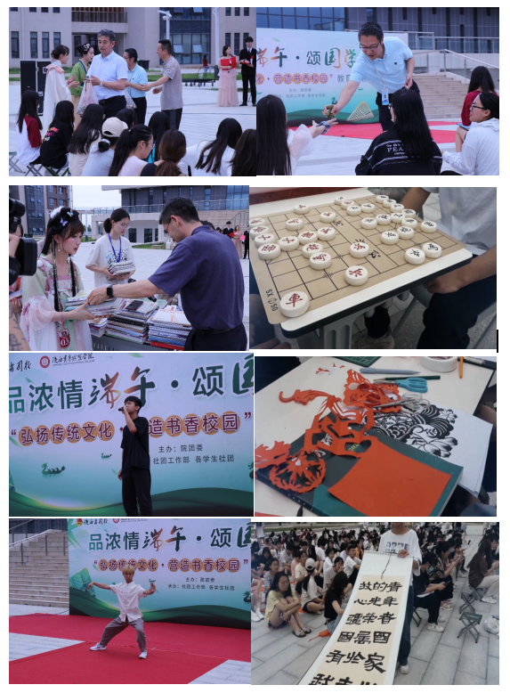 活动现场,图书馆为现场学生赠送期刊读物,后勤服务管理中心送上端午粽子。活动以宿莽文学社汉服展示《书简舞》开场,纸语轩·纸艺社,墨韵书画摄影协会、少儿·完美画社分别带来书法绘画、剪纸、手抄报、Diy香包等文化创意作品展示;博雅传统文化协会、精武协会带来传统武术表演;校园广播站进行了国学诗词朗诵,音乐社进行了经典歌曲演唱;音控社、羽毛球社等社团设立的象棋、围棋、汉服走秀等比赛项目赢得同学们积极参与。
