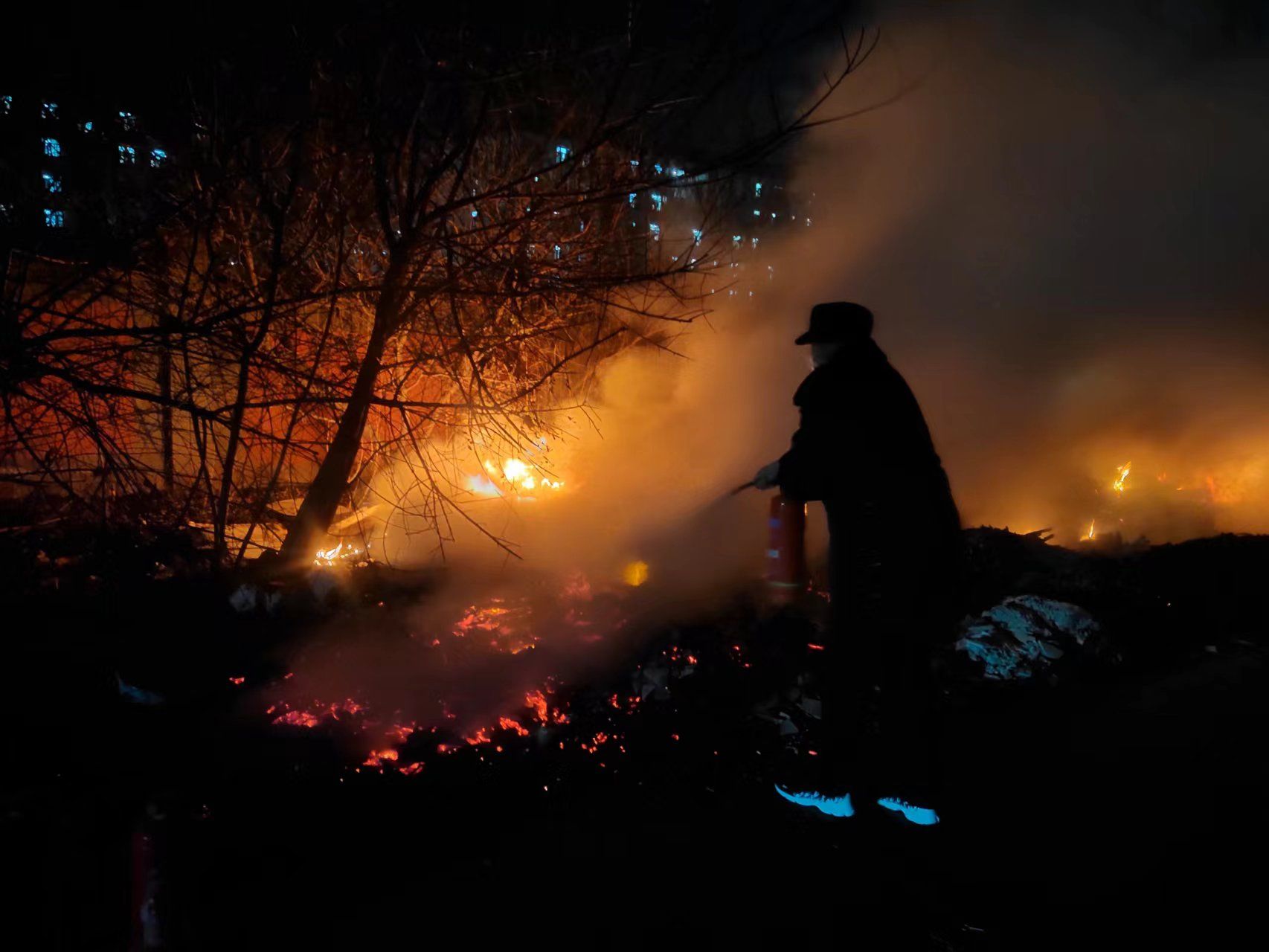 校(院)值班领导韩凯军遂带领保卫处处长姚书芳,第一时间到场指挥灭火,保卫处值班干部王怀、校卫队分队长郑文波、队员高海海、张红波、董敏安、后勤服务管理中心工作人员许文龙、刘见民一起全力灭火,22时许火势蔓延得到有效控制。经大家共同奋战,22时30分许明火全部扑灭。