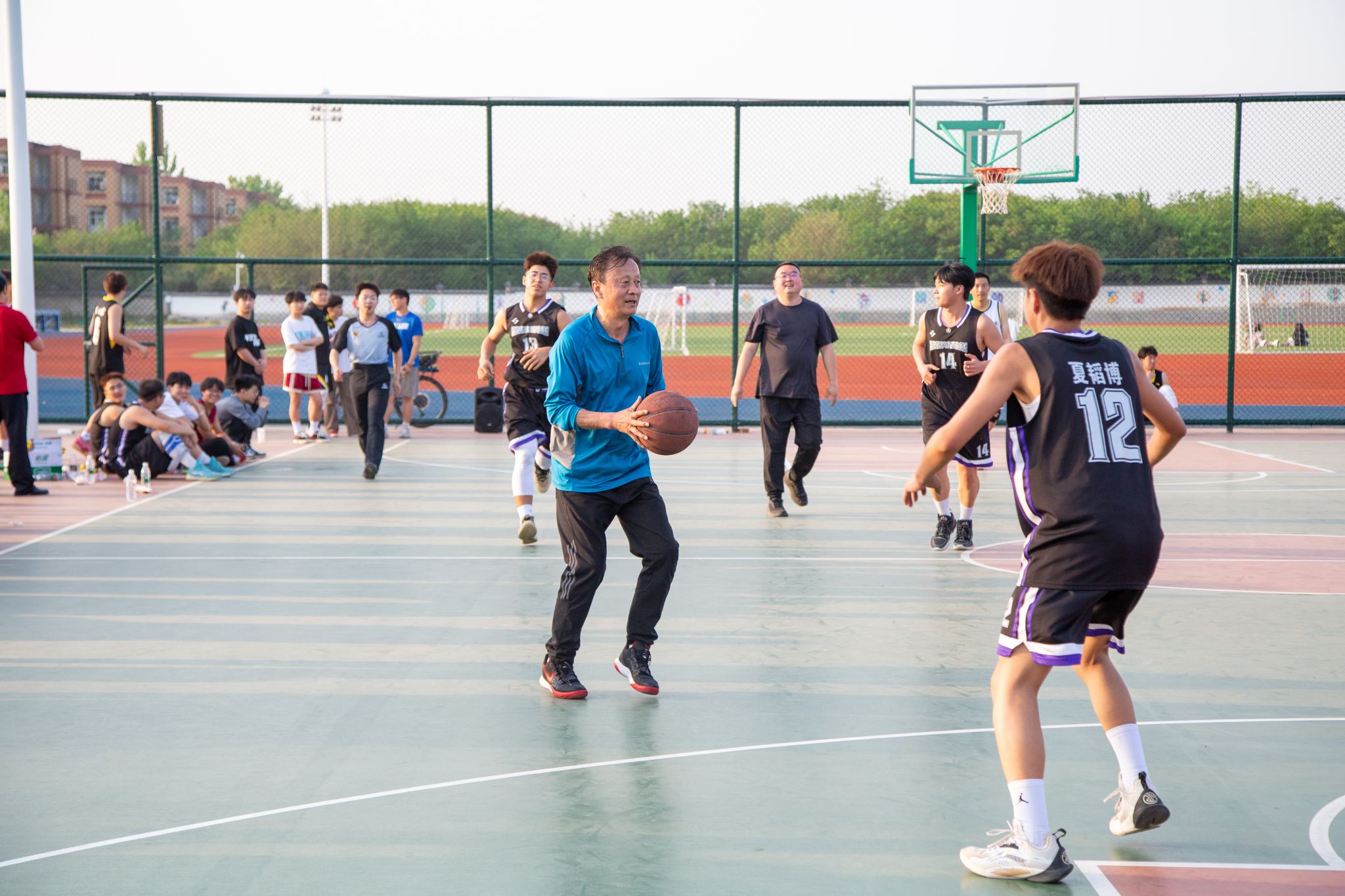 本次篮球友谊赛参赛队伍由教职工男子篮球队和学生代表队组成。党委书记温锋科和后勤服务管理中心主任许庆林首发上阵,带领教工队伍与同学们同场竞技比拼。