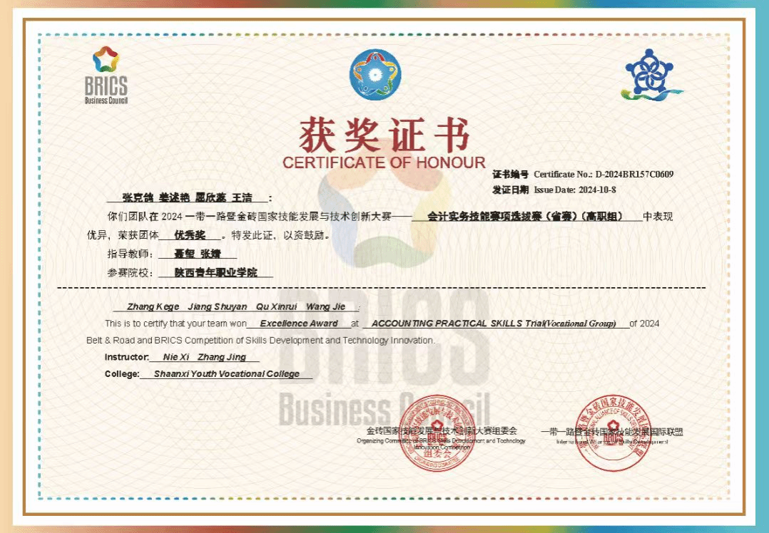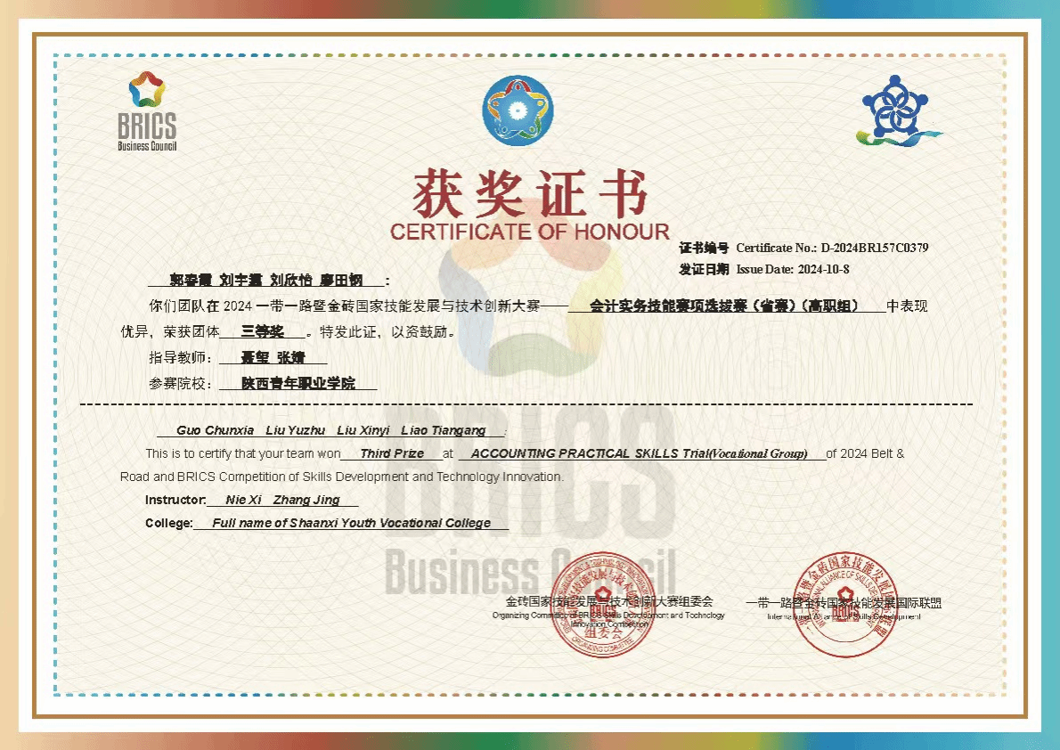 近日,2024一带一路暨金砖国家技能发展与技术创新大赛“会计实务”技能赛项(高职组)竞赛结果出炉,我校数字经济与数字技术系2022级、2023级大数据与会计专业学生刘欣怡、刘宇翥、郭春霞、廖田钢、张克鸽、姜述艳、屈欣蕊、王洁等八位同学组成的两支参赛队伍,在聂玺、张婧两位老师的指导下,经过近两个月的紧张备赛,最终斩获三等奖和优秀奖。