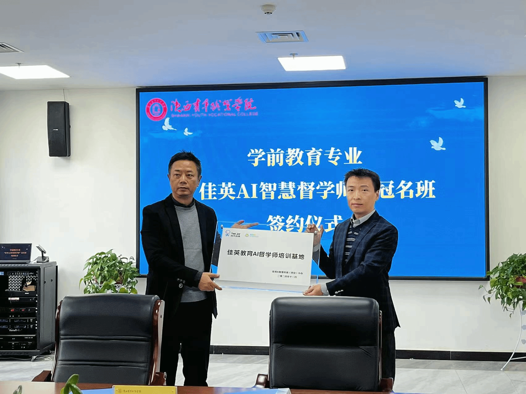 11月21日下午,学前教育专业“佳英AI智慧督学师”冠名班签约仪式在长安校区举行。副校长韩凯军出席并致辞,学前教育系党总支书记、副主任刘延隆,西安佳音文化传播有限公司总经理王龙军、英语眼(中国)智慧学习中心西安服务处首席代表许京丽、西安文睿文化传播有限责任公司负责人段朋利及部分教师、学生代表参加签约仪式。签约仪式由学前教育系副主任朱凯利主持。
