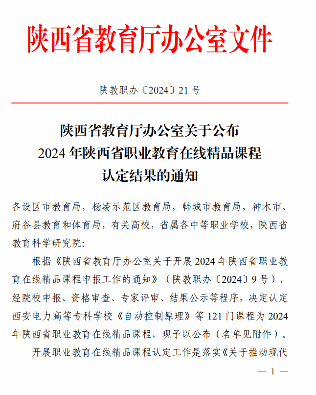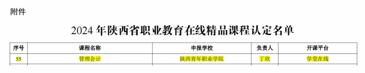 近日,陕西省教育厅办公室公布了《陕西省教育厅办公室关于2024年陕西省职业教育在线精品课程认定结果的通知》,我校数字经济与数字技术系教师丁欣讲授的管理会计课程被认定为2024年陕西省职业教育在线精品课程。