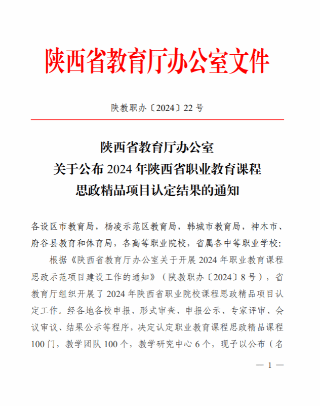 日前,陕西省教育厅办公室公布了《陕西省教育厅办公室关于2024年陕西省职业教育课程思政精品项目认定结果的通知》,数字经济与数字技术系教师丁欣讲授的会计学基础课程入选陕西省职业教育课程思政精品项目,教学团队被认定为省级课程思政教学团队。