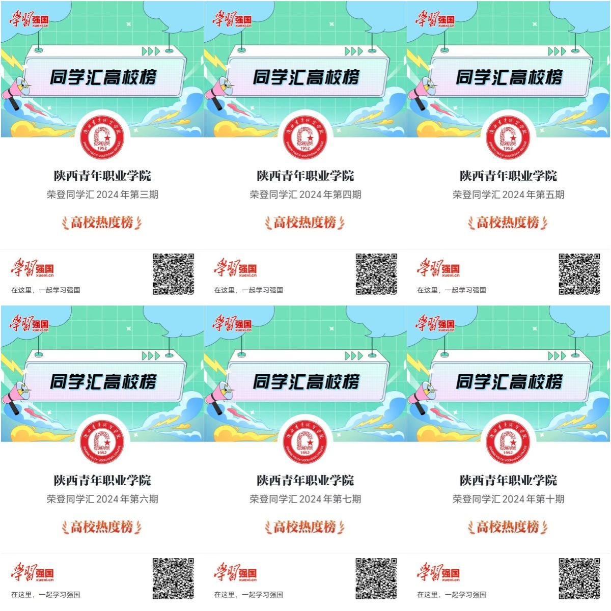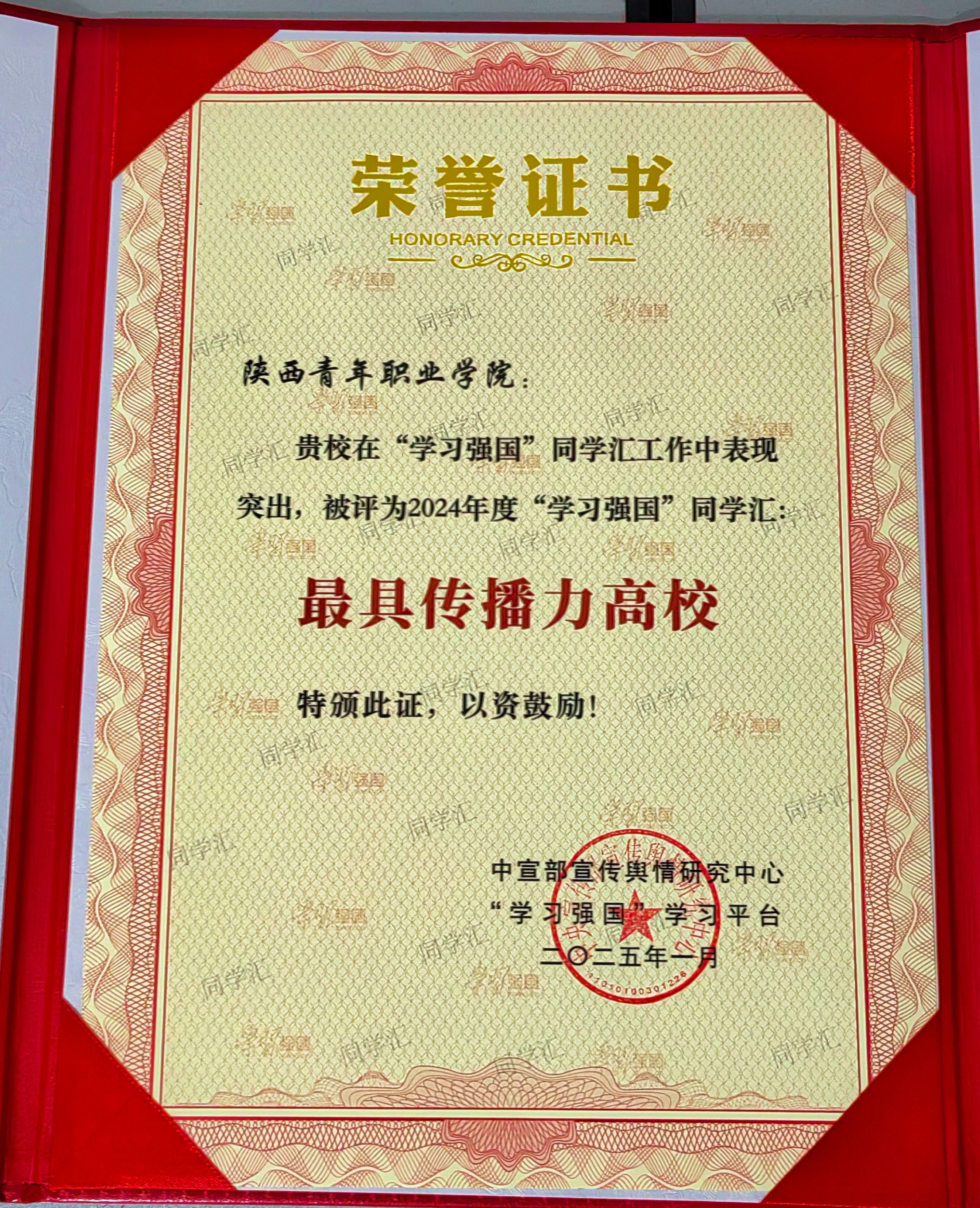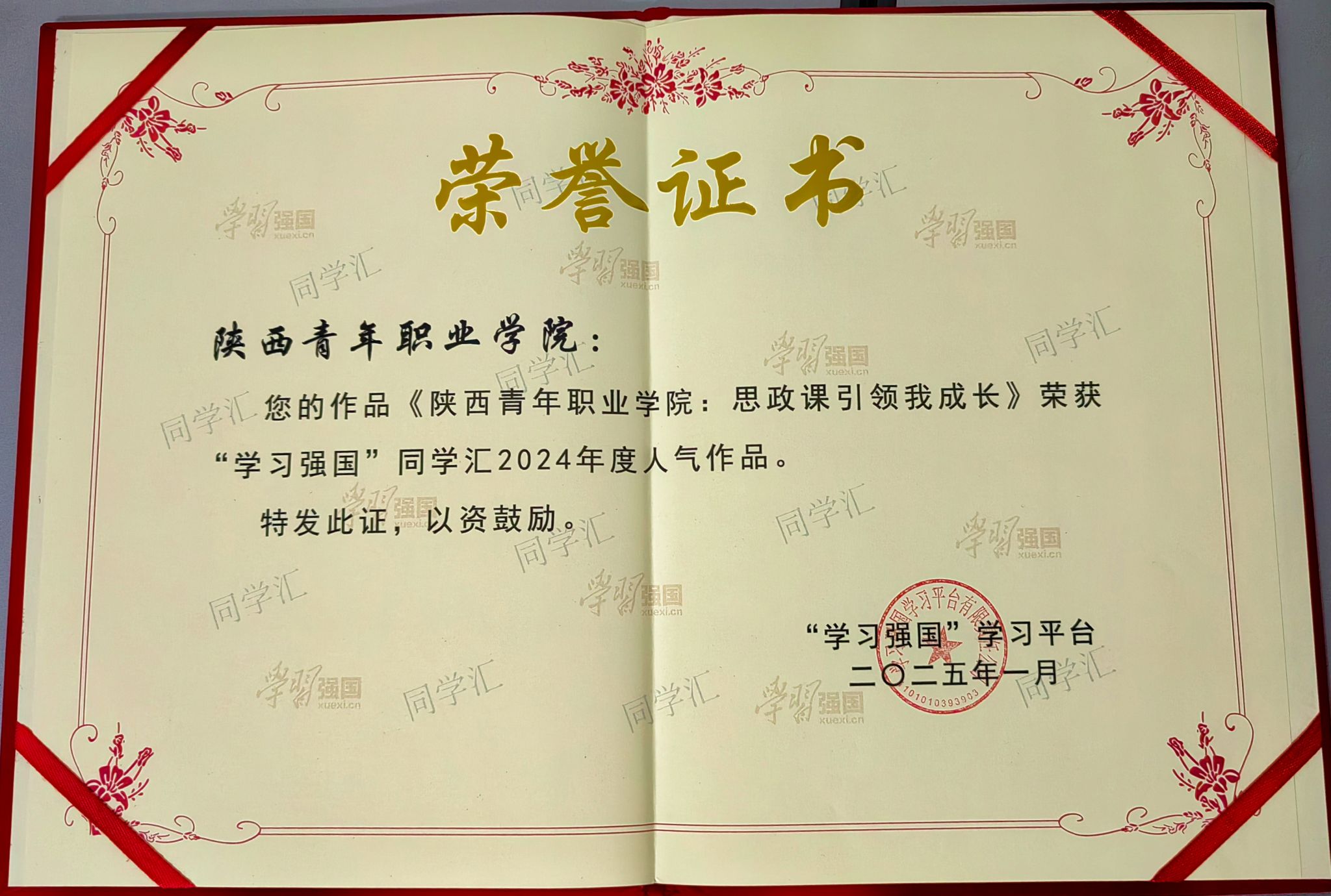 此次“学习强国”学习平台向全国52所高校授予了“最具传播力高校”荣誉称号,其中,陕西省有8所高校,我校是全省唯一获此项殊荣的高职院校。2024年12月,“学习强国”学习平台从2024年同学汇上线的5万多件作品中精选400件进行集中展示,最终评选出100个年度人气作品(高校)、100个年度人气作品(个人)和50个2024年度高校融媒团队,我校的“思政课引领我成长”“阳光洒满校园”等2件作品分获人气作品高校奖和个人奖。