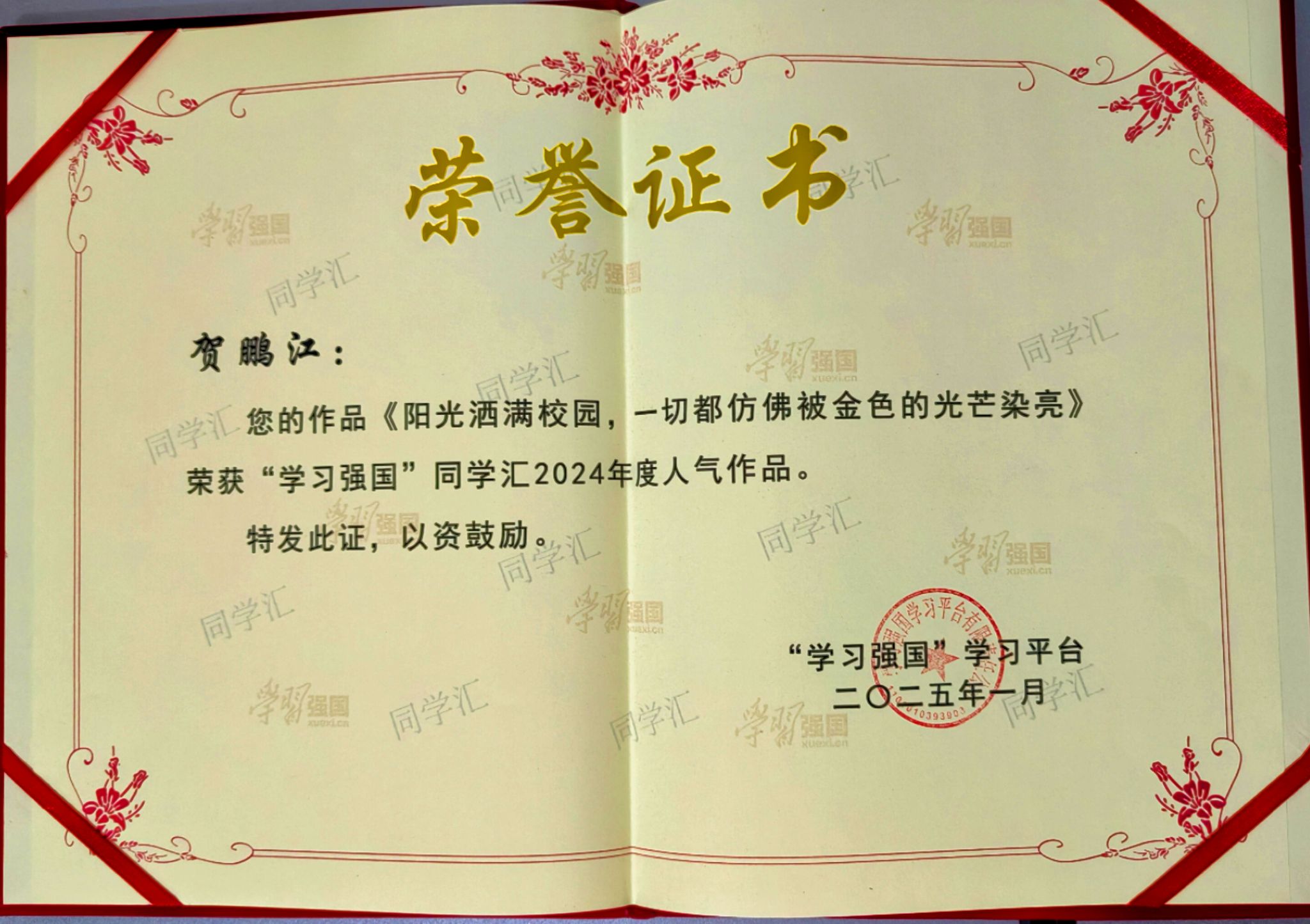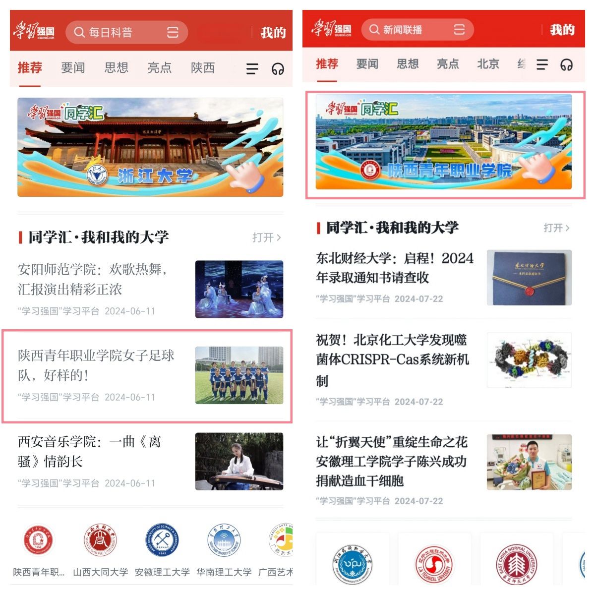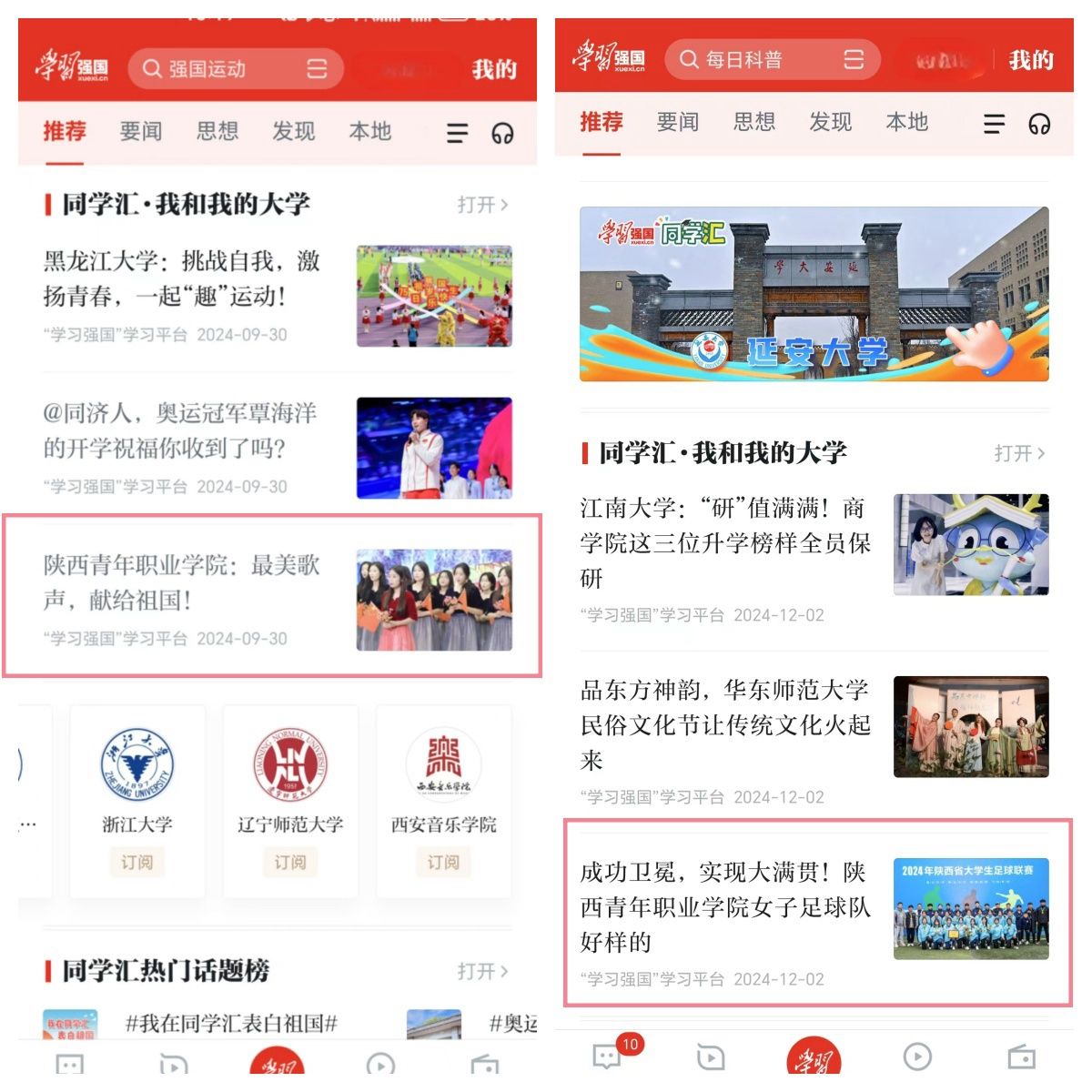 此次“学习强国”学习平台向全国52所高校授予了“最具传播力高校”荣誉称号,其中,陕西省有8所高校,我校是全省唯一获此项殊荣的高职院校。2024年12月,“学习强国”学习平台从2024年同学汇上线的5万多件作品中精选400件进行集中展示,最终评选出100个年度人气作品(高校)、100个年度人气作品(个人)和50个2024年度高校融媒团队,我校的“思政课引领我成长”“阳光洒满校园”等2件作品分获人气作品高校奖和个人奖。