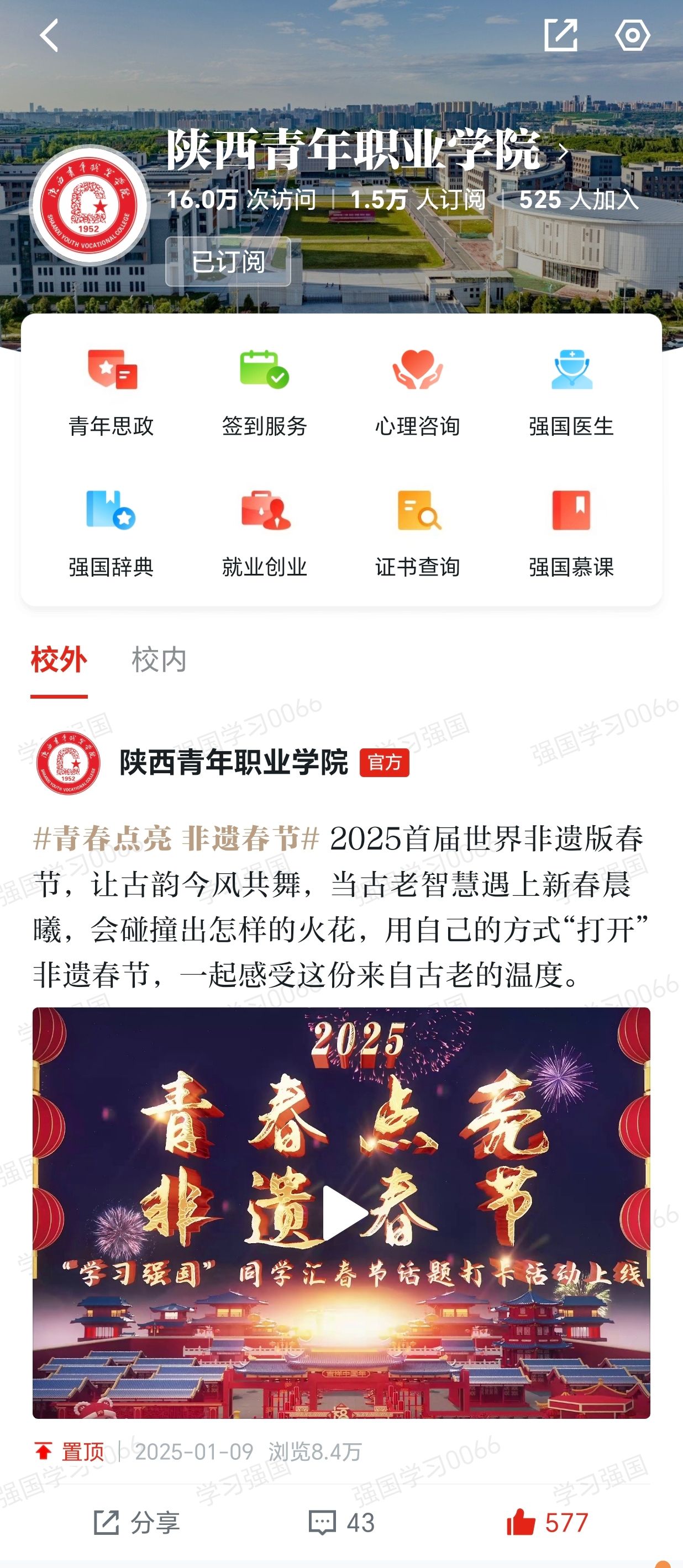 我校自2023年9月开通“学习强国”同学汇以来,安排专人负责运营和维护平台,围绕党建思政、人才培养、教育教学、校园文化等方面积极创作、发布各类图文、短视频等作品,2023年度曾获同学汇人气作品奖一项。截止2025年1月,我校同学汇首页访问量达16万,1.5万人订阅,2024年共6次荣登同学汇全国高校排行榜单前50名,7次荣登人气作品榜单全国高校前100名,13次被学习强国同学汇首页推荐,进一步扩大了学校的美誉度和影响力。