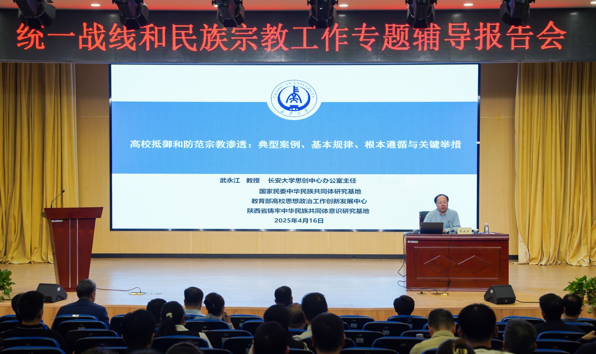 今年4月15日是第十个全民国家安全教育日,为深入学习贯彻落实习近平总书记关于加强和改进民族工作的重要思想、关于宗教工作的重要论述及相关指示批示精神,坚定不移贯彻总体国家安全观,4月16日,学校在长安校区报告厅举行统一战线和民族宗教工作专题辅导报告会,邀请教育部高校思想政治工作创新发展中心(长安大学)办公室主任武永江教授作专题辅导报告。报告会由党委书记张建宽主持。