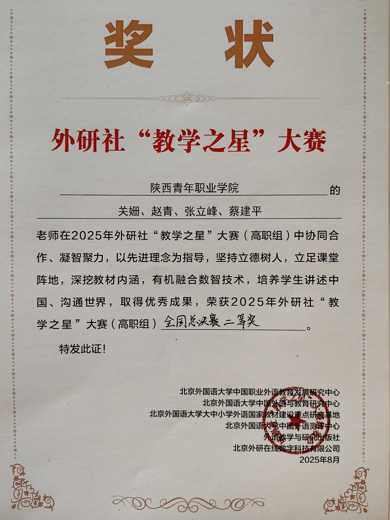 我校教师团队获2025年外研社“教学之星”大赛(高职组)全国二等奖