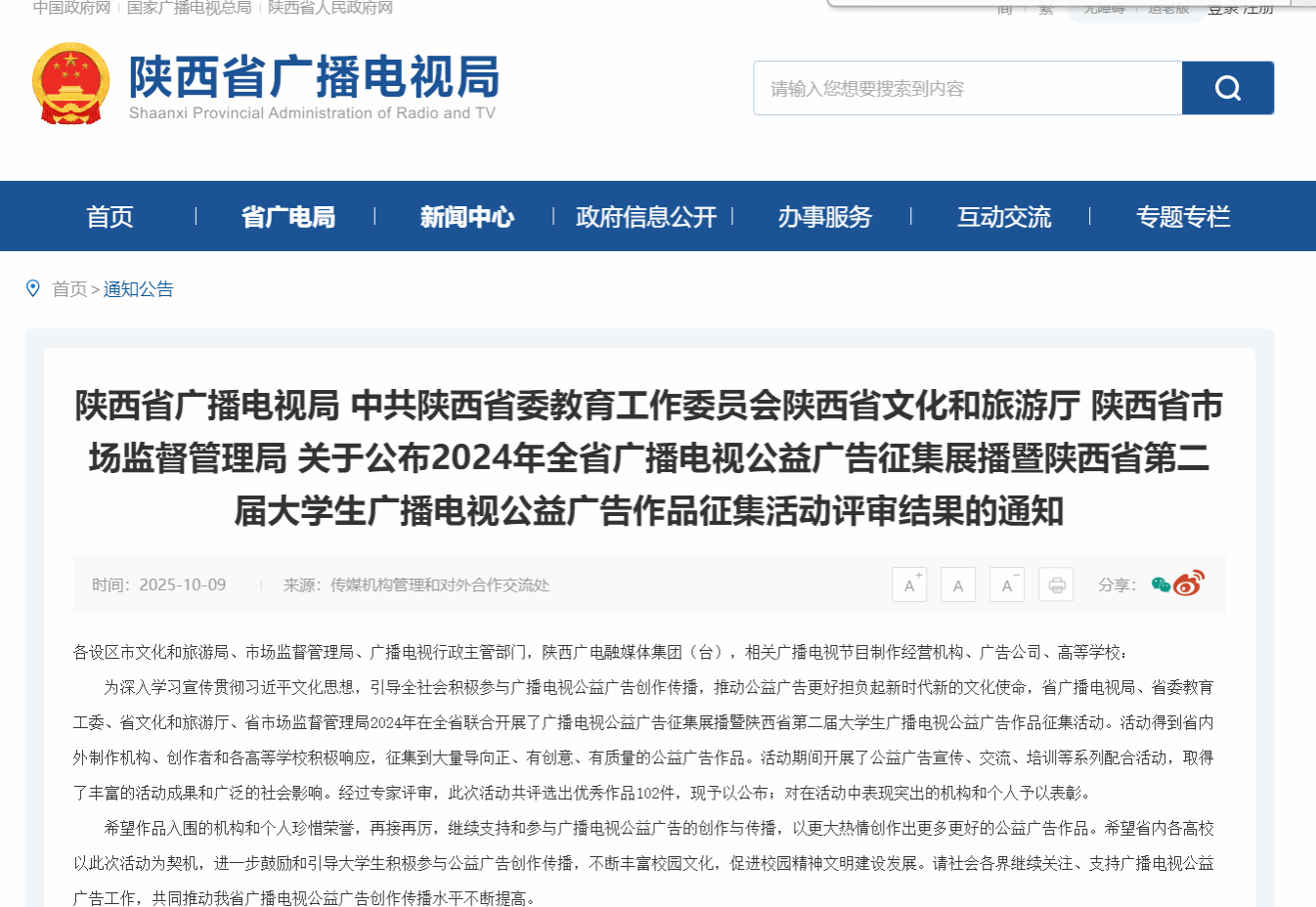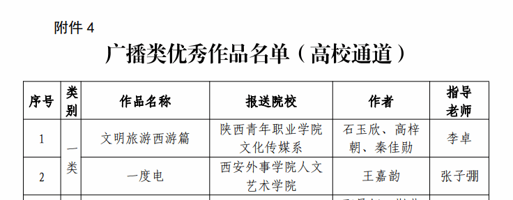 10月9日,由中共陕西省委教育工作委员会、陕西省广播电视局、陕西省文化和旅游厅和陕西省市场监督管理局联合主办的2024年全省广播电视公益广告征集展播暨陕西省第二届大学生广播电视公益广告作品征集活动评审结果揭晓,我校文化传媒系师生在广播类赛项表现亮眼,斩获多项荣誉:李卓、李瞳指导学生创作的作品荣获学生组一等奖1项、优秀奖1项;李卓、李瞳创作的作品荣获社会组三等奖1项。