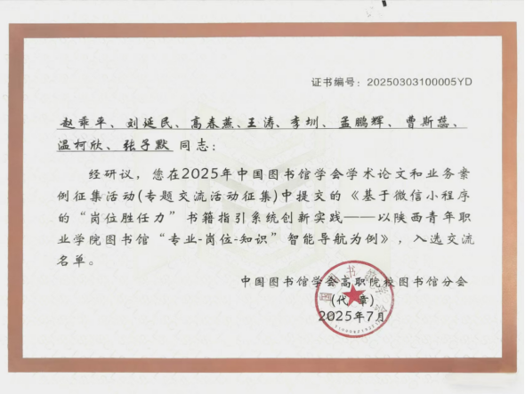 近日,2025年中国图书馆学会学术论文和业务案例征集活动(专题交流活动征集)结果揭晓,我校图书馆报送的业务案例《基于微信小程序的“岗位胜任力”书籍指引系统创新实践——以999全讯白菜网图书馆“专业-岗位-知识”智能导航为例》入选交流名单。