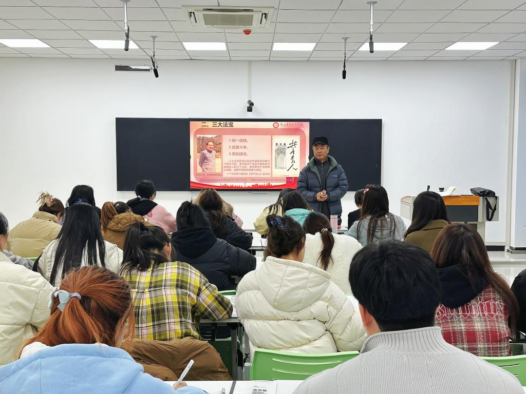 11月20日,为深入贯彻落实面向广大团员和青年开展学习贯彻习近平新时代中国特色社会主义思想主题教育,结合新时代党员发展和教育工作,学前教育系党总支书记、副主任刘延隆为学生讲授党课。入党积极分子、青马学员、学生骨干共计60余名团员和青年参与听课,系团工委书记孙珠琳主持。