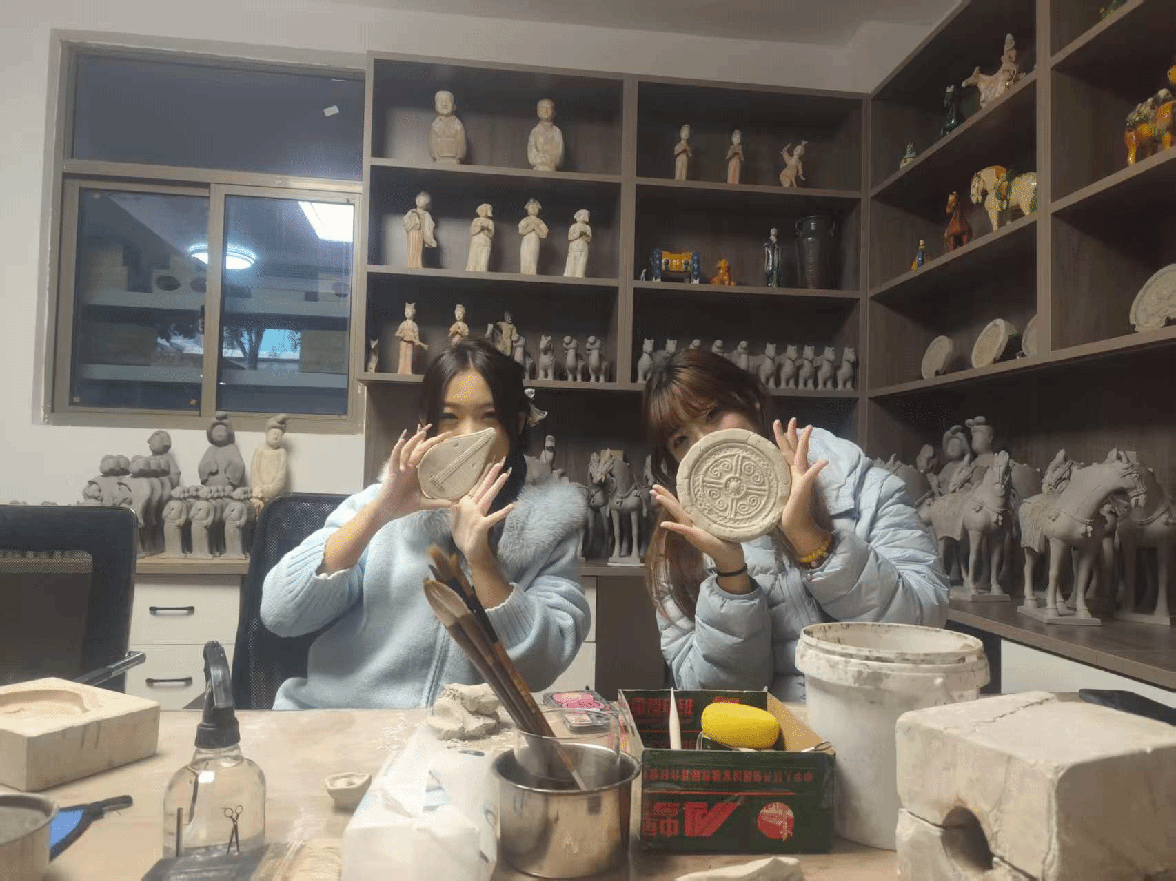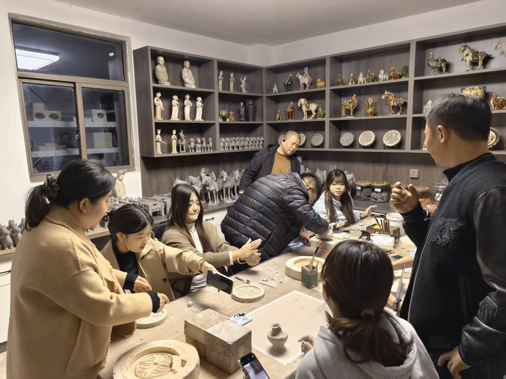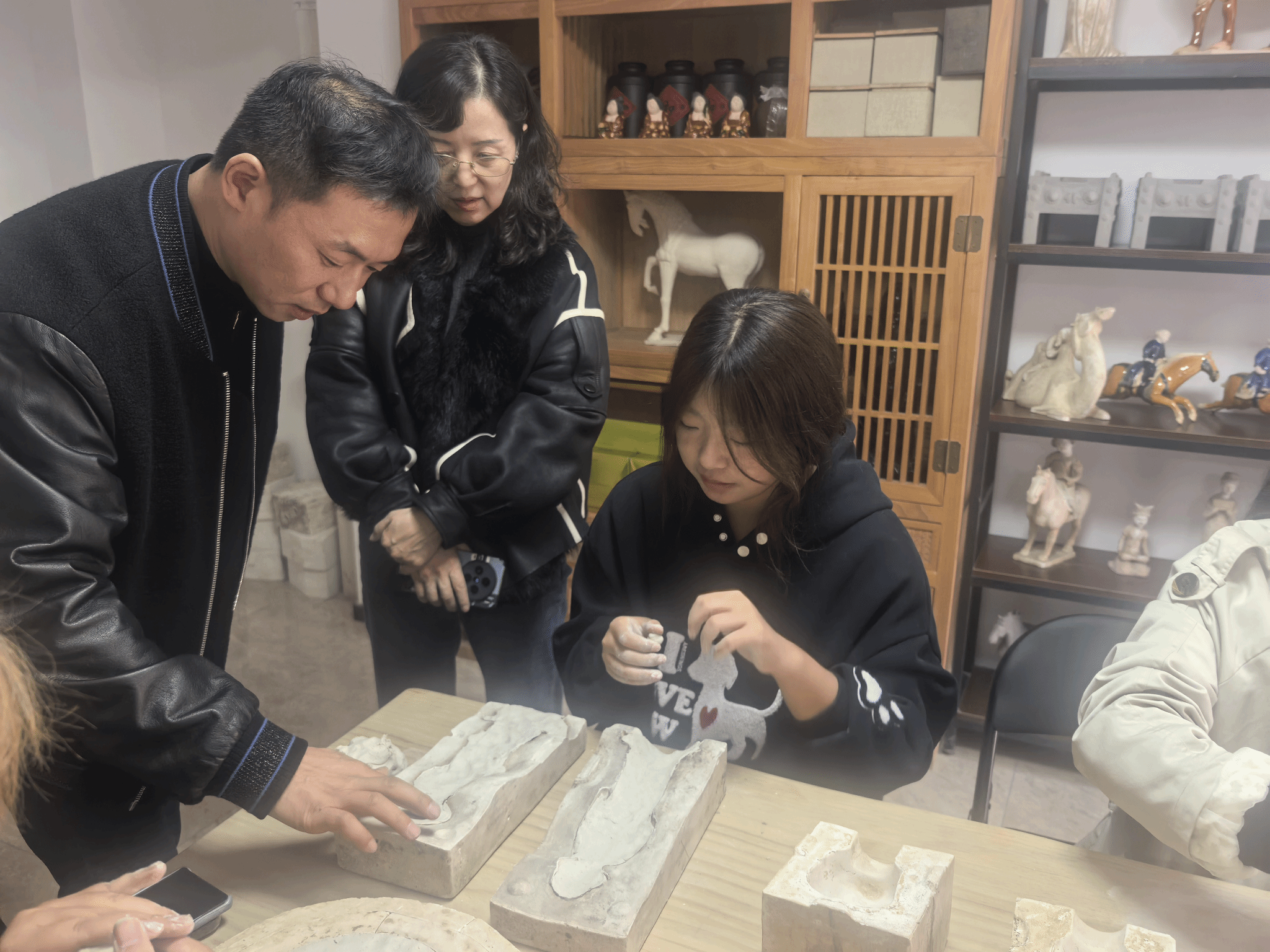揭牌仪式后,活动进入校外实践环节。王瑜、焦姣带领14名学生代表前往唐三彩烧制基地进行实地研学。同学们首先参观了唐三彩制作的整体流程与工作环境,对传统工艺有了初步认识。随后,谭晶伟亲自讲解并演示了唐三彩制作的关键步骤与技巧,并指导学生亲手体验陶器成型过程。基地陶艺教师团队全程跟进指导,及时纠正操作细节,耐心解答各类疑问,确保每位同学都能沉浸式感受传统工艺的精髓。